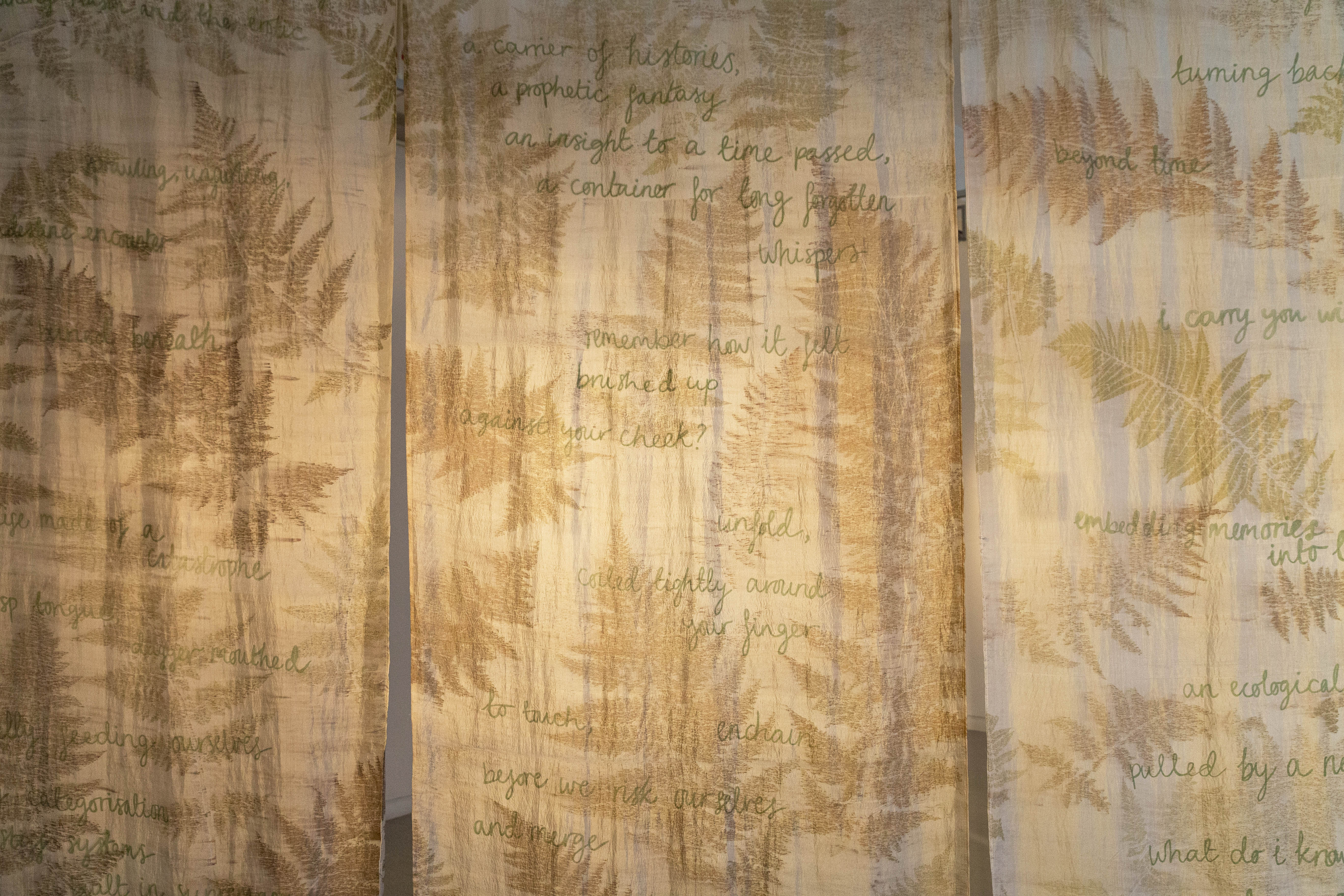 The textile installation is produced through a natural dyeing technique, resulting in the ferns being printed onto the wild ahimsa silk, with the text silk-screen printed using natural dye. As a result, ferns make up both the subject matter and printing mediums of the work.