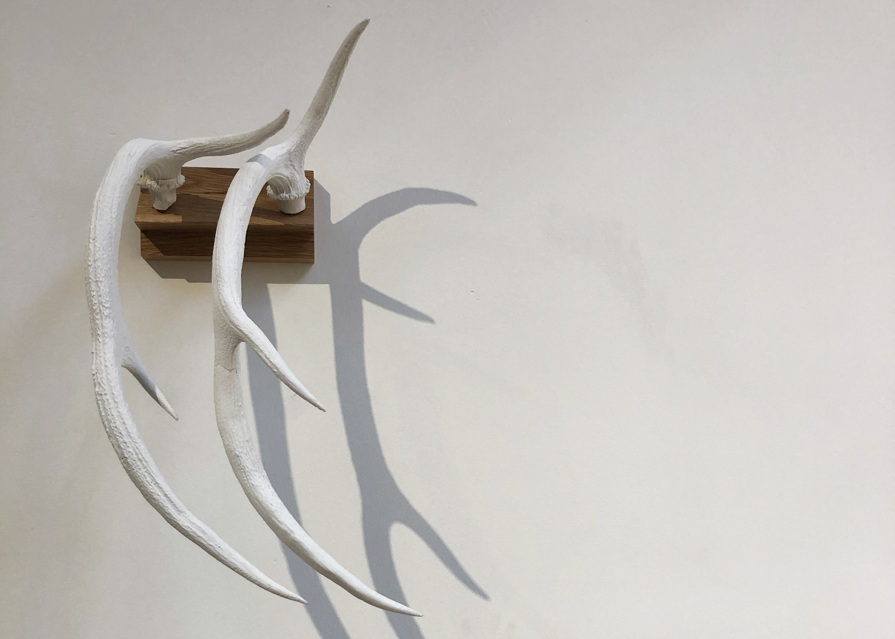 Cast porcelain and silicon antlers on oak mounts.