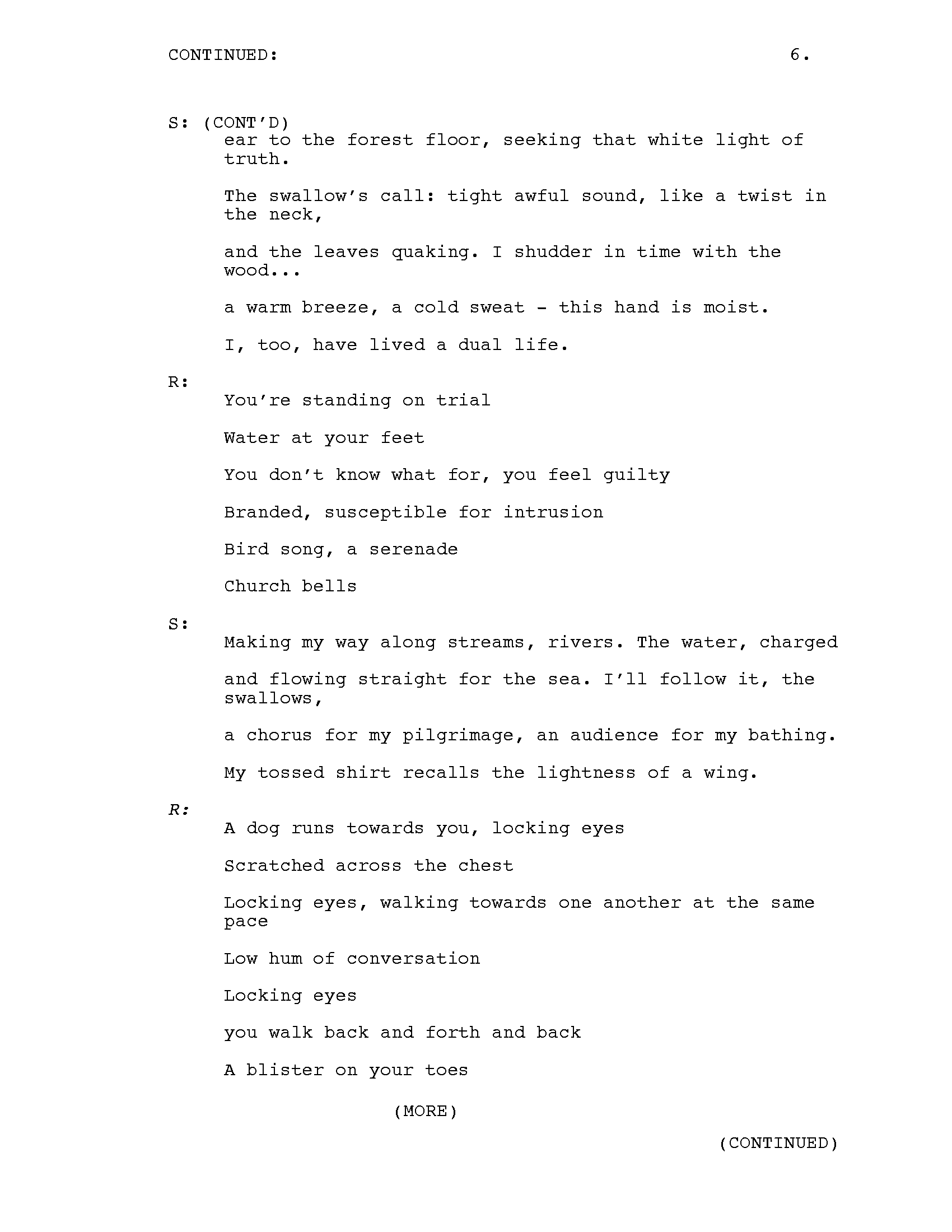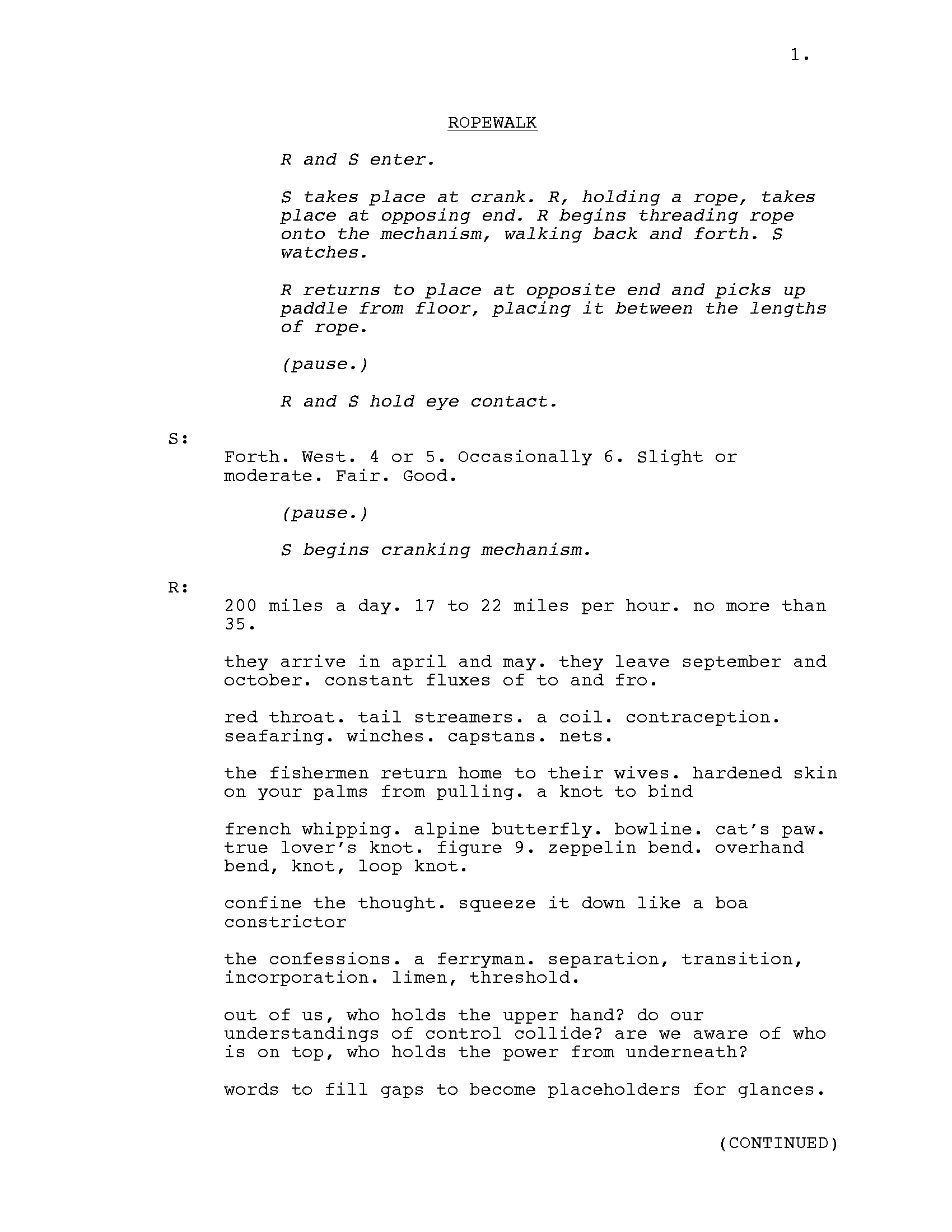 Within the performance of Ropewalk, there is no hierarchy between the language and movement, both forms aid and inform the other. The script for the performance was created through a collaborative writing method, in which the content was produced separately before being edited together, combining and creating shared narratives.